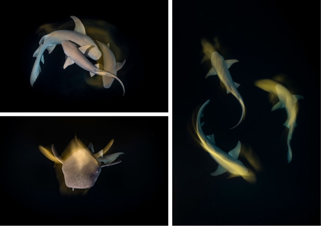 “During a trip to the Maldives last year, we had the chance to encounter tawny nurse sharks up close on a night dive,” Brooke says. “I wanted to capture the elegant movements of the sharks as they danced together under the lights of my strobes. I used both video lights and strobes combined with a slowed shutter speed to capture the swirling effect of the light around them. The video lights lit them as they moved and when the strobes fired it froze part of the moment.”