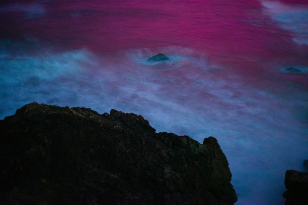 The Southern Lights glow brightly above the sea, blending neon pinks and cool blues into a mystical palette. This image captures the rare harmony between moving water and shifting light, unveiling the ocean as a magical reflection of the night sky.