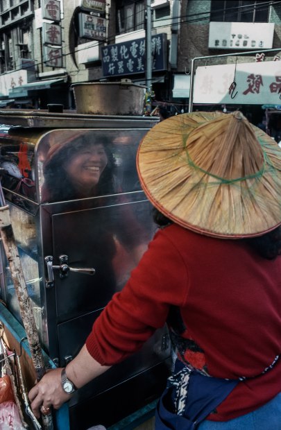 A moment of quiet exchange captured through reflection. Shot on Kodachrome 64