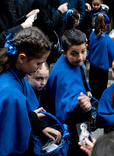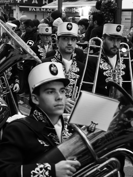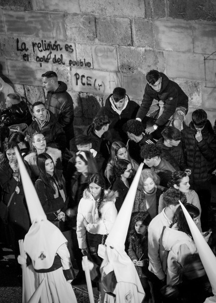 Semana Santa, Andalusia, Spain. The sights, sounds, solemnity and festivity of the numerous processions which occur during Holy Week. These images from Seville, Cordoba and Granada capture the pageantry, rituals and scale of the processions and the seriousness of all of the participants no matter their age. The ornate and heavy Pasos, carried by the Costaleros on long circular routes throughout the streets. Lead and accompanied by the Nazarenos wearing their capirote hoods, the elegant Donas, with peinita and mantilla, carrying rosaries and candle sticks, represent the mourners of Christ. As the band plays, Ninos, boys and girls, hand out religious cards and sweets to the spectators who line the streets. The crowds of all ages run ahead of the procession, in their best clothes to get the best vantage point, navigating road blocks, only adds to the excitement and carnival like atmosphere. The experience on the final evening was summed up by the graffiti which frames the crowd on the wall of the Granada Cathedrale quoting Karl Marx " La religion es ei opio del publeo" ( Religion is the Opiim of the People)