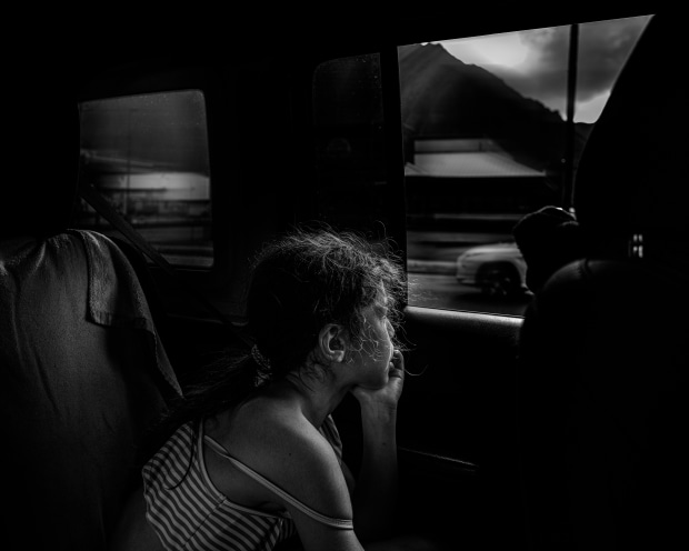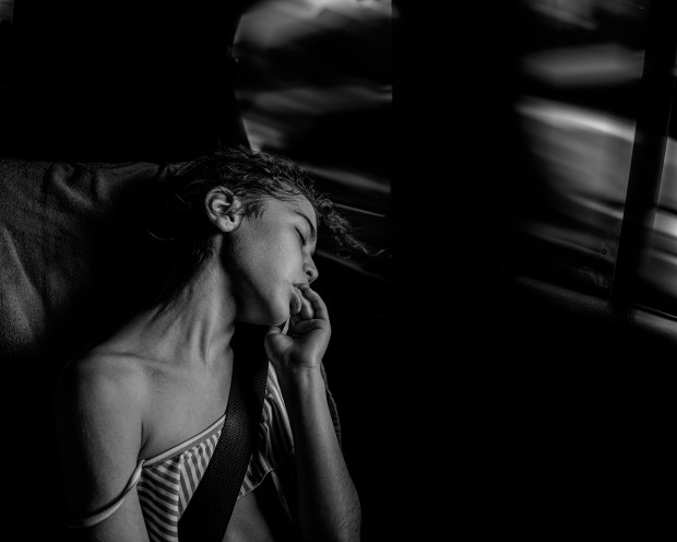 Heading home after a fulfilled day at the beach, the phases of tiredness kick in. The light kisses her as if to say good night while the motion of the car rocks her like a cradle. Soon her eyes get heavier, her body gets limper until she has fallen deeply asleep.