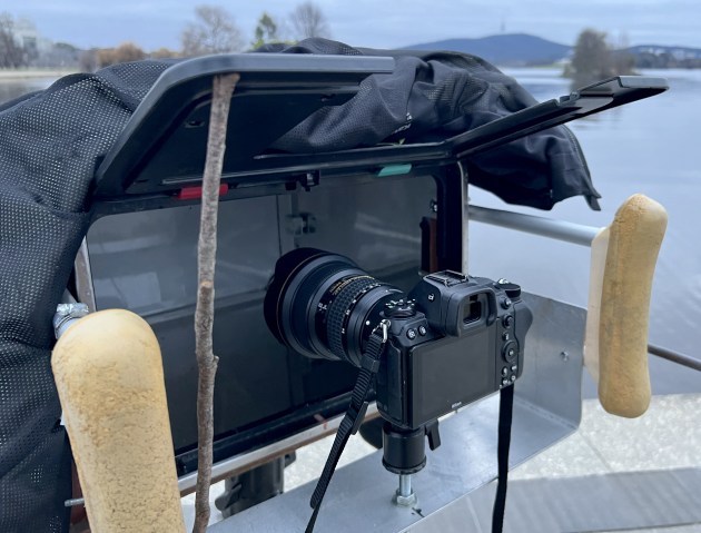 At the rear of the Trash Cam is a Nikon Z 7 with either a 24-70mm or 12-24mm lens. A black material hood is used to cover the camera and block out extraneous light. For a shot taken in full daylight, the exposure settings on the Nikon Z 7 would typically be 1/30s at f/8.0 with ISO 100.